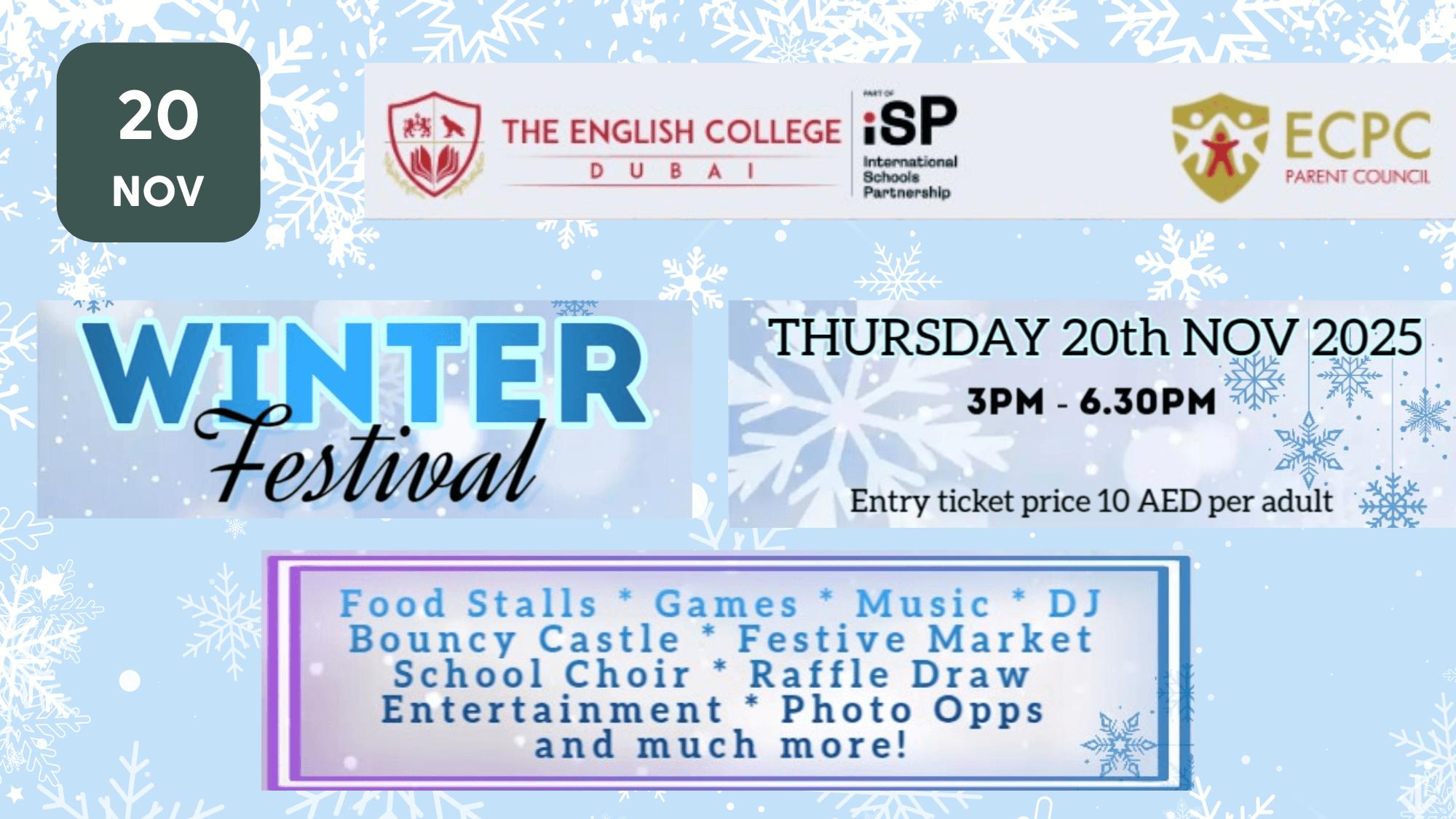 Join us for a fun-filled Winter Festival at The English College Dubai with food stalls, games, music, a festive market, and family entertainment.